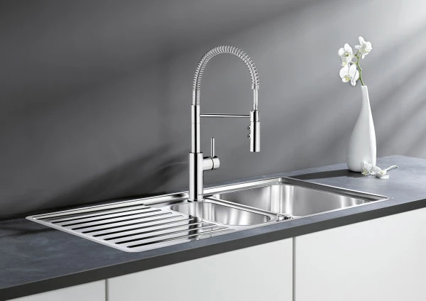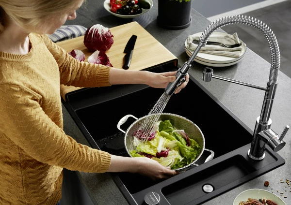 Den høye, fleksible tut har knapper, der du enkelt skifter mellom de to forskjellige stråletyper; dusj og en kraftigere skyllestråle. Funktionen gjør at du altid har den perfekte stråle, når du skal skylle dine grønnsaker eller fylle de helt store gryter og kanner med vann.