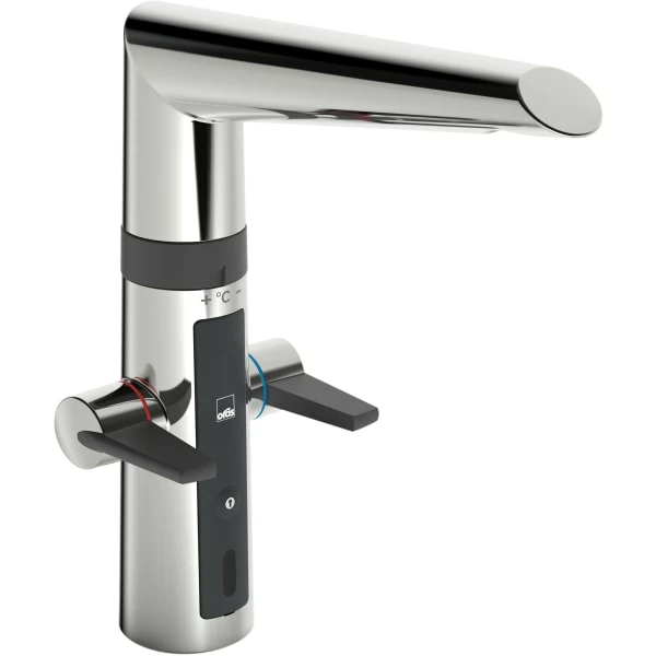 Med det hygieniske og praktiske Oras Optima kjøkkenbatteriet kan du skape trygghet og overskudd i kjøkkenet. Vanntemperaturen kan innstilles til en fast temperatur, og berøringsfri funksjon kan installeres på den mørkegrå ringen. Grepene er ergonomiske og lett tilgjengelige, også når man har en stor gryte som skal fylles med vann.