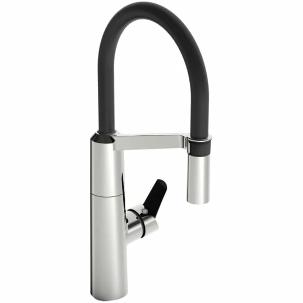 Kjøkkenarmaturet fra Oras Optima har et stilig, moderne design, med et industrielt uttrykk. Armaturet har fleksibel høy slange i matt sort, med justerbar svingradius, slik at du får rengjort alle vaskens hjørner, samt store gryter og panner.