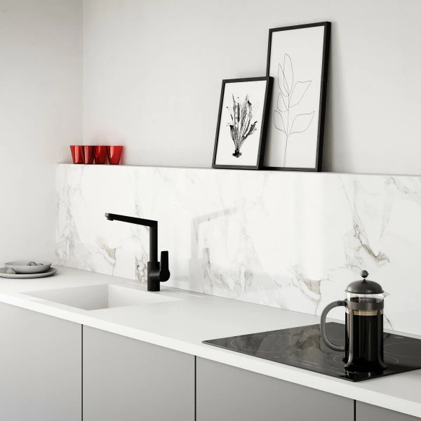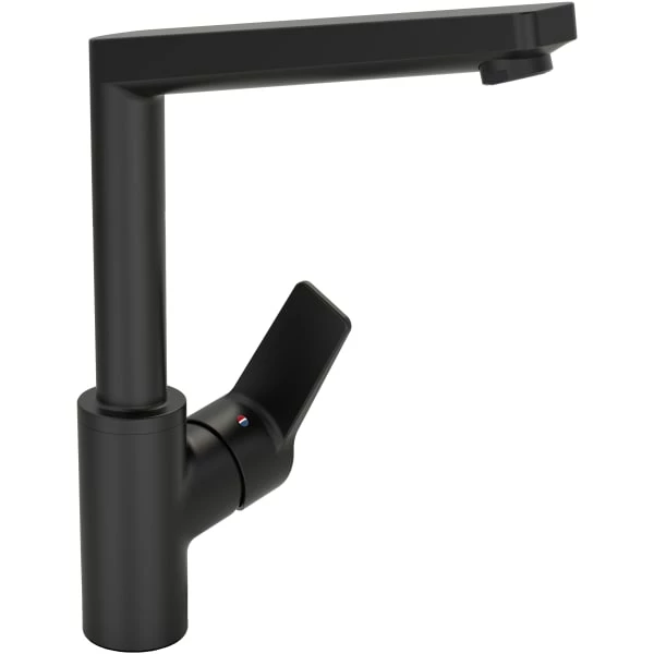 Kjøkkenbatteri har en høy L-formet tut med en sjenerøs svingradius på 150°. Blanderen har innebygd sperre for å begrense temperatur og strømning. Det store grepet gjør det lett å justere vannmengde og -temperatur.