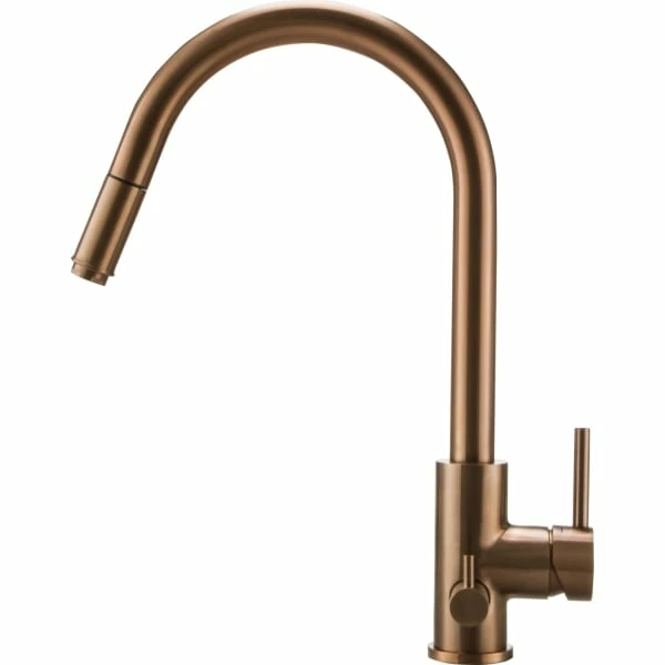 Kjøkkenbatteri i tidløs design. Med høy tut og uttrekkbart munnstykke er det lett å skylle oppvasken eller rengjøre kjøkkenbenken.