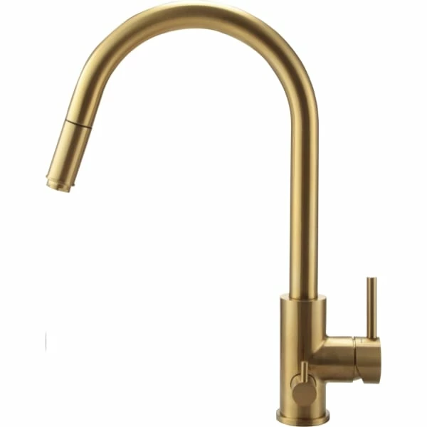 Kjøkkenbatteri i tidløs design. Med høy tut og uttrekkbart munnstykke er det lett å skylle vasken eller rengjøre kjøkkenbenken.
