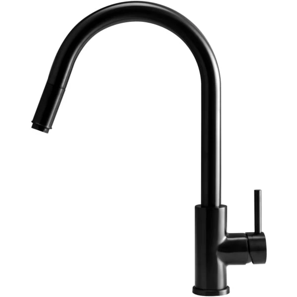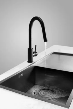 Kjøkkenbatteri i tidløs design. Med høy tut og uttrekkbart munnstykke er det lett å skylle vasken eller rengjøre kjøkkenbenken.