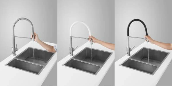 Kjøkkenbatteri i catering design og fleksibel tut, samt dusj-munnstykke som gjør det lett å rengjøre vask og kjøkkenplate. Leveres standard med stålfjær, men ønsker du en kontrastfarge er det enkelt å bytte mellom gummislangene i matt sort eller hvit som følger med.