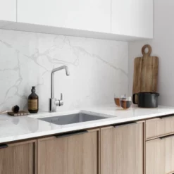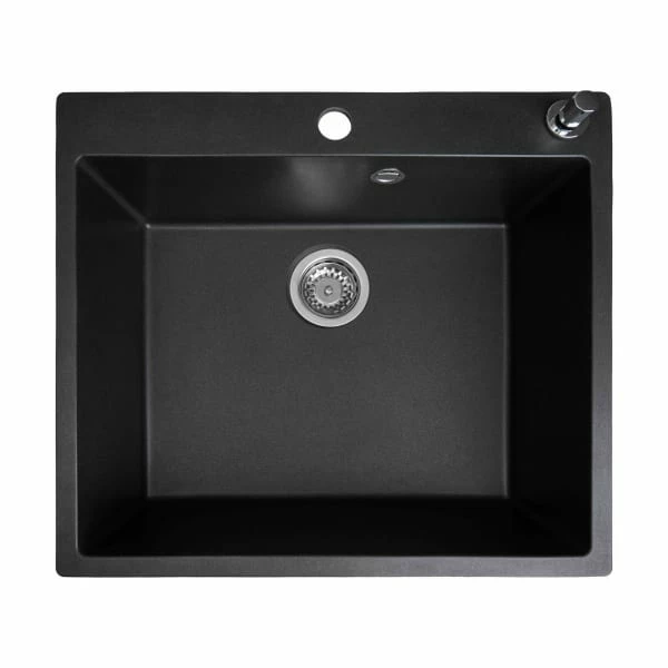 Sort køkkenvask i granitek med XL kumme. Kummen er stor nok til et helt stekebrett. Dybde 22 cm. Markant kant rundt om kummen som gir et kvalitetsuttrykk. Leveres med high end avløp system med åpne/lukkeknapp av ventilen til lett montering.